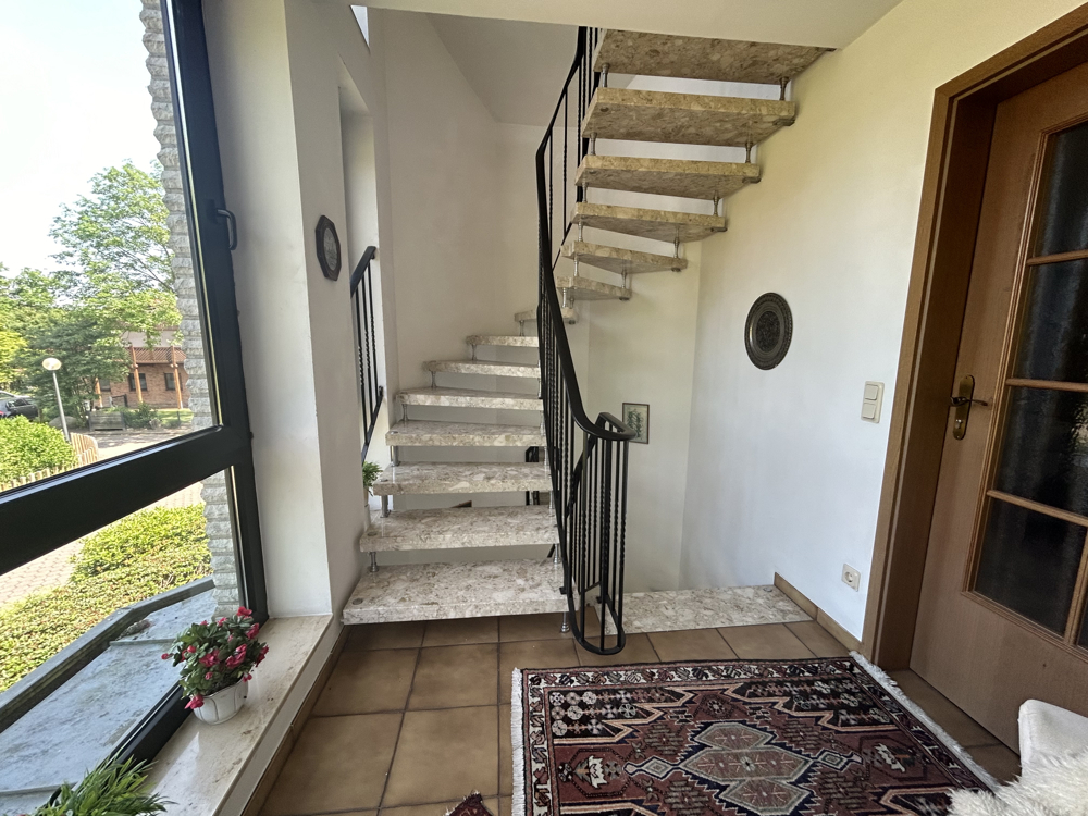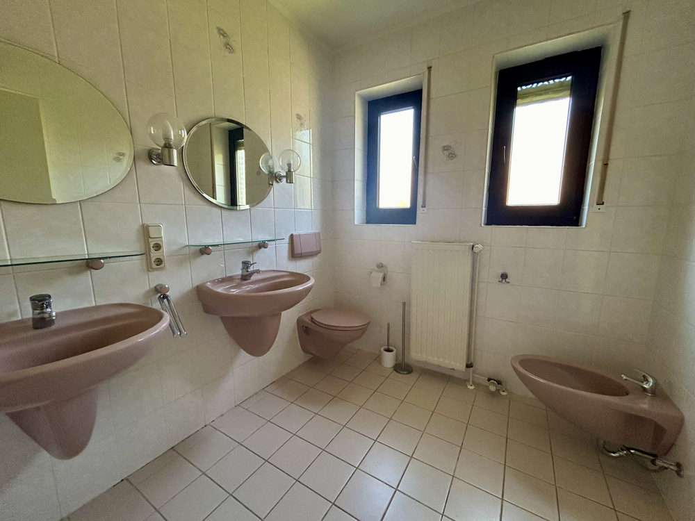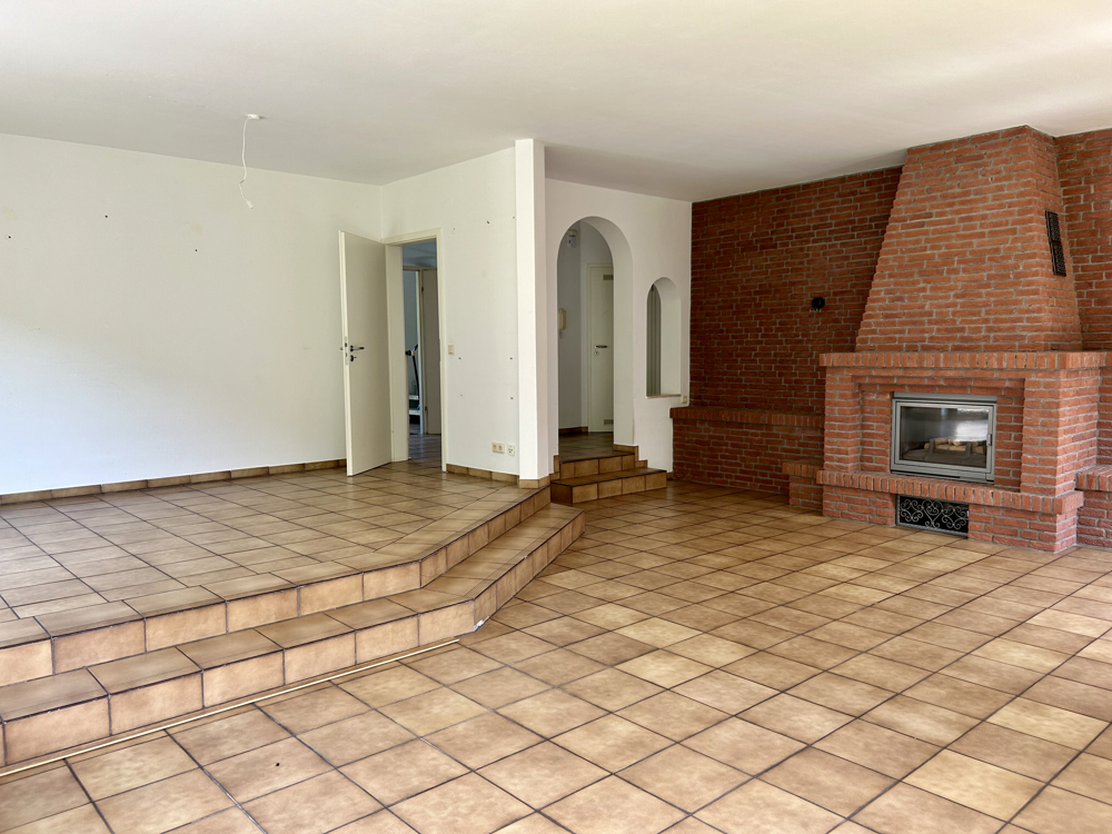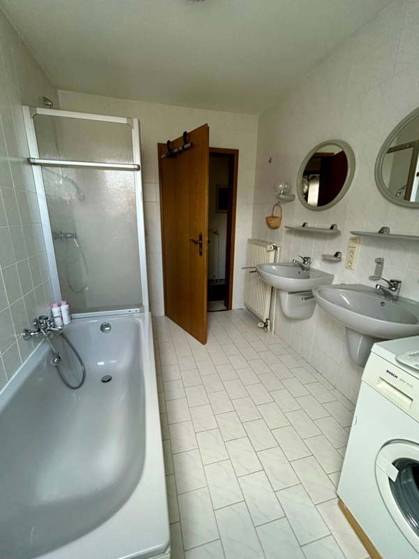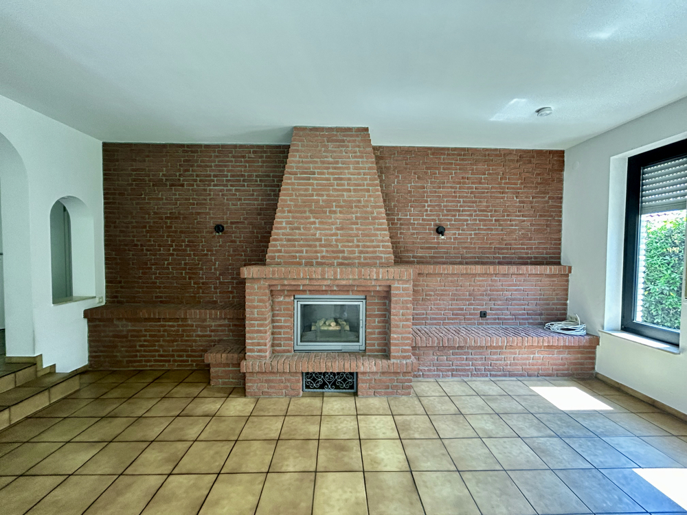 Betreten Sie die Erdgeschosswohnung durch einen aparten Eingangsbereich, der Sie direkt in das beeindruckende Wohn- und Esszimmer führt. Dieses Zimmer besticht durch eine rustikal verklinkerte Kaminwand mit einem Gaskamin und eine helle, freundliche Atmosphäre. Von hier aus gelangen Sie zur Terrasse, sowohl durch das Wohn- und Esszimmer als auch von der Küche aus. Die Wohnung bietet vier Schlafzimmer, zwei Bäder mit jeweils zwei Waschbecken – eines davon ist ausschließlich vom Hauptschlafzimmer aus zugänglich – und ein Gäste-WC. Eine neue Therme wurde Ende 2020 installiert.