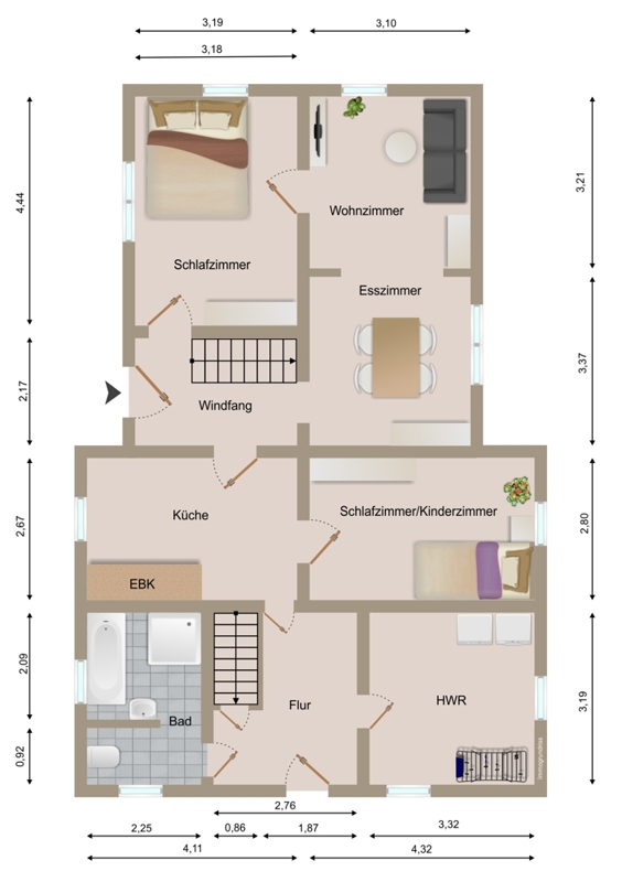 Flur// Hauswirtschaftsraum// Badezimmer (Wanne, Dusche, Becken, WC)// Küche (mit Einbauküche)// Kinderzimmer// Wohn- und Esszimmer// Kinderzimmer// Flur