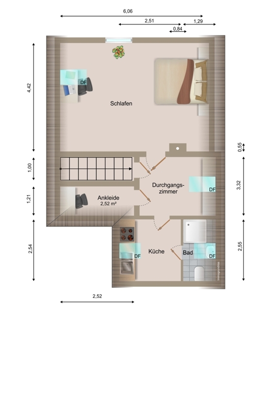 Durchgangszimmer// Schlafzimmer// Küche (mit Einbauküche)// Ankleidezimmer/ Abstellraum// Badezimmer (Dusche, Becken, WC, WA)