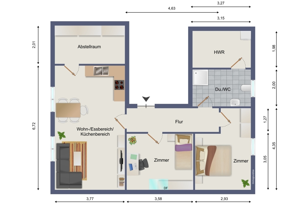 Flur// Wohn-Ess- und Kochbereich// Abstellraum// Schlafzimmer// Kinderzimmer// Badezimmer (Dusche, Becken, WC)// Hauswirtschaftsraum