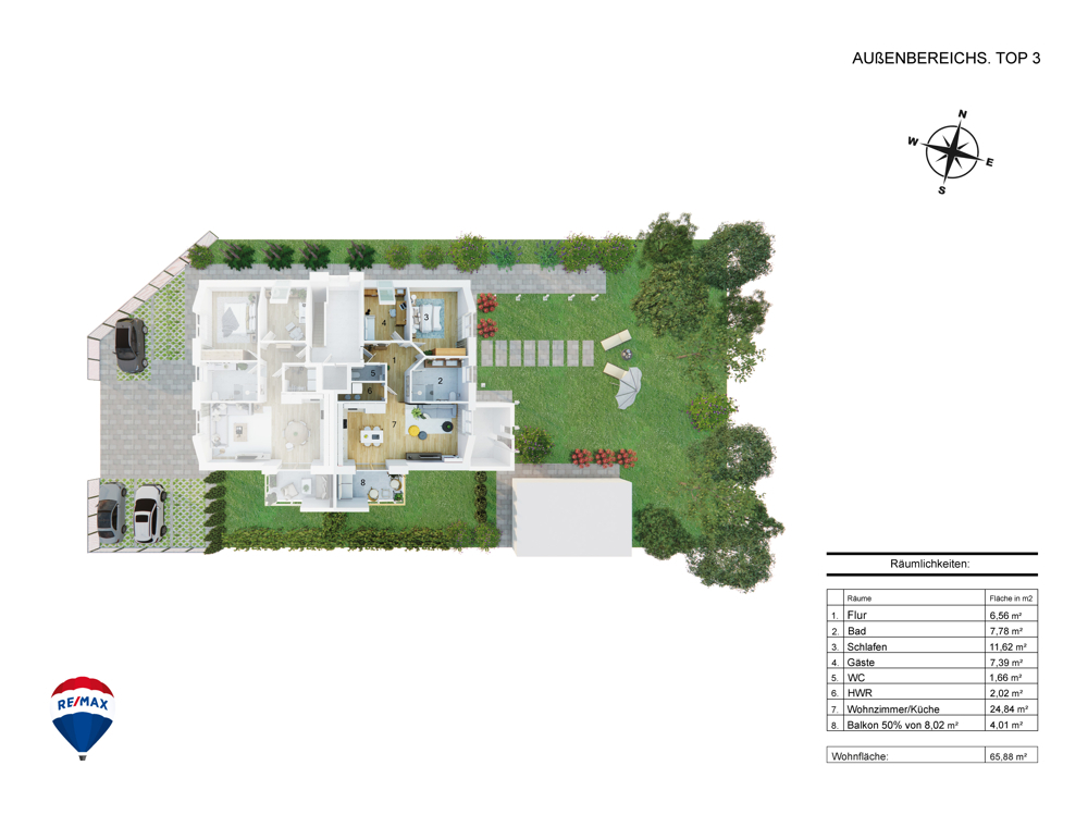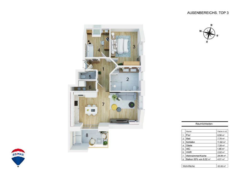 - Balkon (Südseite): 8,02 m², ideal für entspannte Sonnenstunden