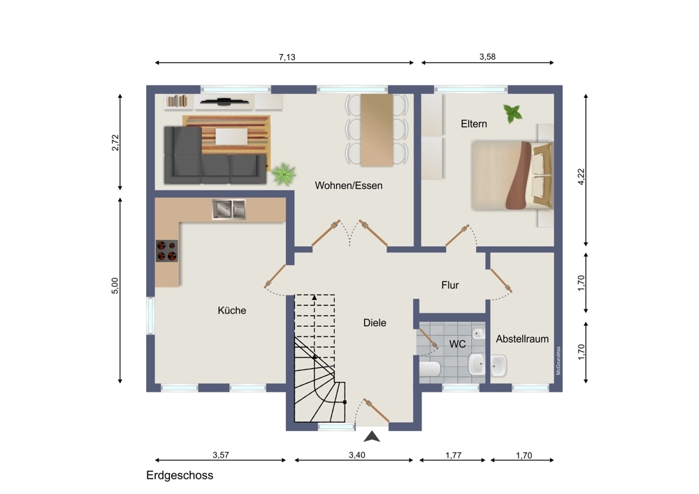 Die Immobilie betreten Sie über einen hellen Eingangsbereich. Das Erdgeschoss verfügt über 85 qm und ist perfekt aufgeteilt in ein lichtdurchflutetes Wohn- und Esszimmer, einer Küche, einem Esszimmer, Schlafzimmer, einem Gäste WC, sowie einem Vorratsraum/ Hauswirtschaftsraum.