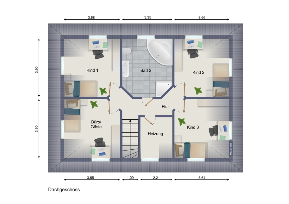 Flur// Schlafzimmer// Kinderzimmer// Kinderzimmer// Kinderzimmer// Badezimmer (Becken, Becken, Dusche, Wanne, WC) Fußbodenerwärmung// Heizungsraum