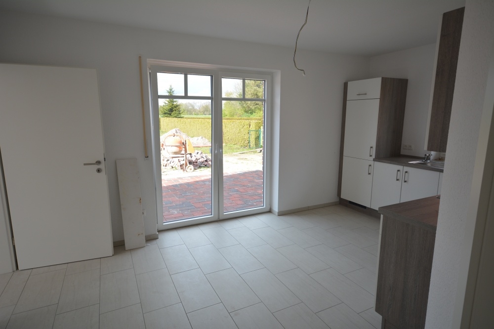 Wohnzimmer, Küche mit EBK, HRW mit Ausgang, Schlafzimmer, Bad mit Dusche, kleiner Abstellraum. Zur Wohnung gehört ein kleines Grundstück mit Terrasse, ein Carport und Geräteschuppen. Die Wände haben Raufaser in weiß gestrichen, der Boden ist verfließt und das Schlafzimmer hat einen Laminatboden. Die Kaltmiete beträgt 660 Euro. Die Betriebskosten belaufen sich auf 70 Euro, Heizkostenvorauszahlung 85 Euro, Kaution zwei Kaltmieten. Strom ist direkt mit den Versorger abzurechnen.