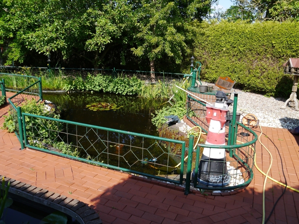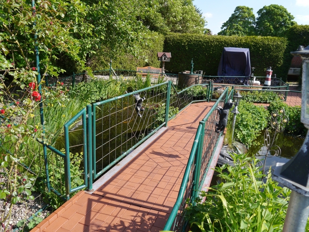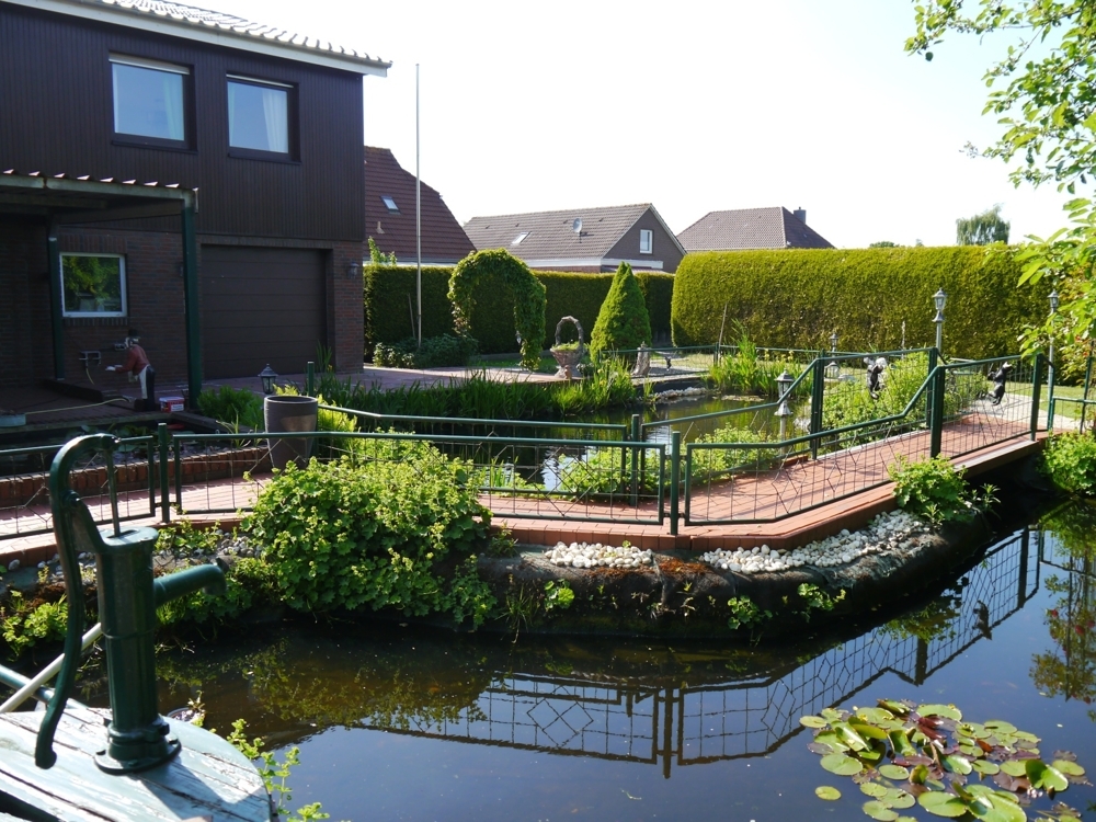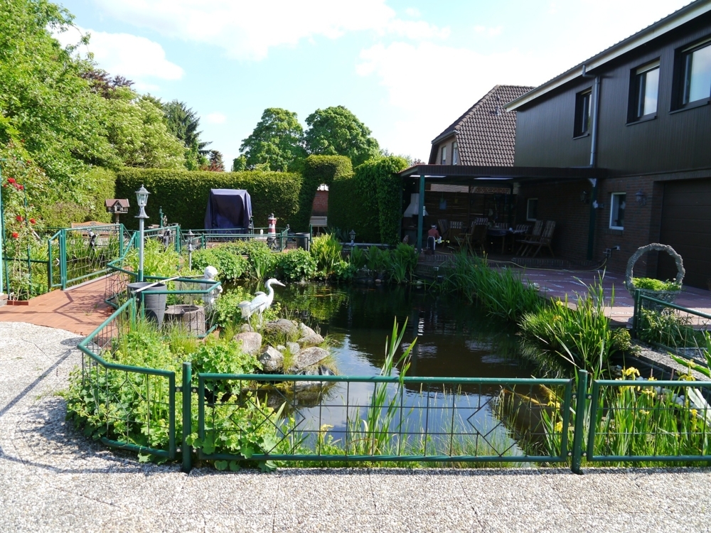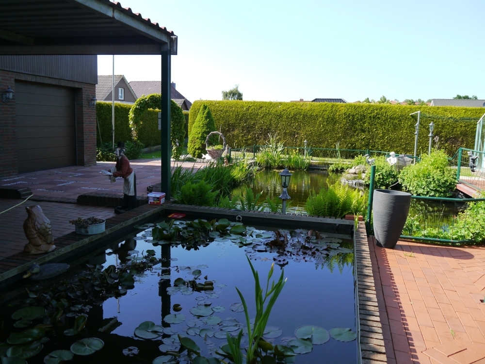 Das Objekt ist umgeben von Tujahecken, Stauden und Büschen. Zudem gibt es auf diesem Grundstück etliche Obstbäume (Birne, Apfel, Pflaume etc.). Der Vorgarten ist mit div. Beeten und einer großen Rasenfläche pflegeleicht angelegt. Im hinteren Gartenbereich befindet sich eine einmalig schöne Teichlandschaft mit drei Terrassen, einem Gewächshaus und einem ausgepflasterten Bereich zum Wäsche trocknen.
