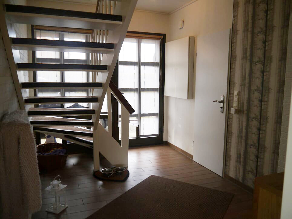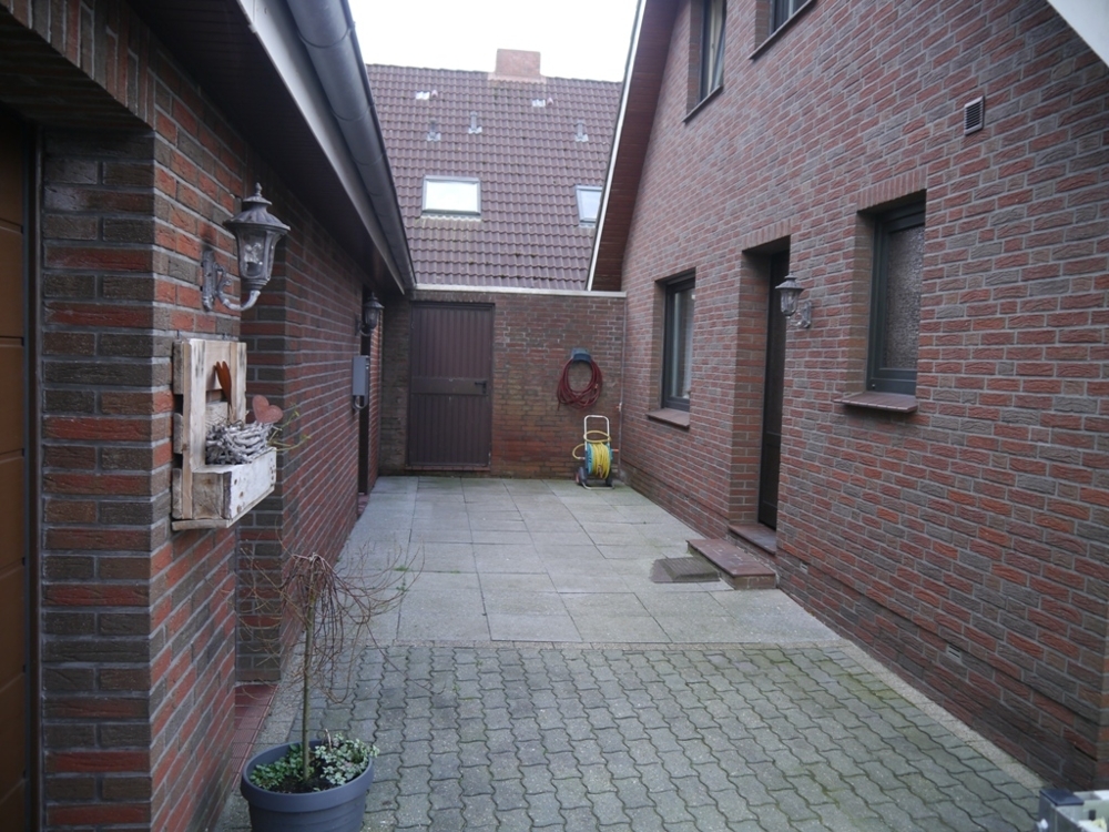 Zwischen dem Haupthaus und dem 2011/2012 erstellten Anbau gibt es einen kleinen, wind- u. sichtgeschützten Innenhof, von dem aus man in das Haupthaus sowie in die Einliegerwohung und die Garage mit Werkstatt gelangt. Ein seitlicher Zugang ermöglicht es, auf die Südseite des Hauses zu gelangen. Der Anbau wurde auf dem massiven Grundgerüst einer ca. 100qm großen Dreifach-Garage (vormals mit Flachdach) in Holz-Rahmenbauweise mit Leimbindern errichtet. Im Anbau befindet sich eine erstklassige Einlieger- bzw. Ferienwohnung mit einer Größe von ca. 75qm. Im Eingangsbereich befindet sich ein kleiner Flur mit Stauraum und Anschlüssen für Waschmaschinen, Trockner, Kühlaggregate sowie die Heizungsanlage und das Treppenhaus, das in die Einlieger-/Ferienwohnung führt, die über einen sehr imposanten, offenen Wohn- u. Essbereich, ein sehr großzügig geschnittenes Schlafzimmer, ein stilvolles und geräumiges Badezimmer sowie über einen breiten Flur und einen Abstellraum im Eingangsbereich verfügt.