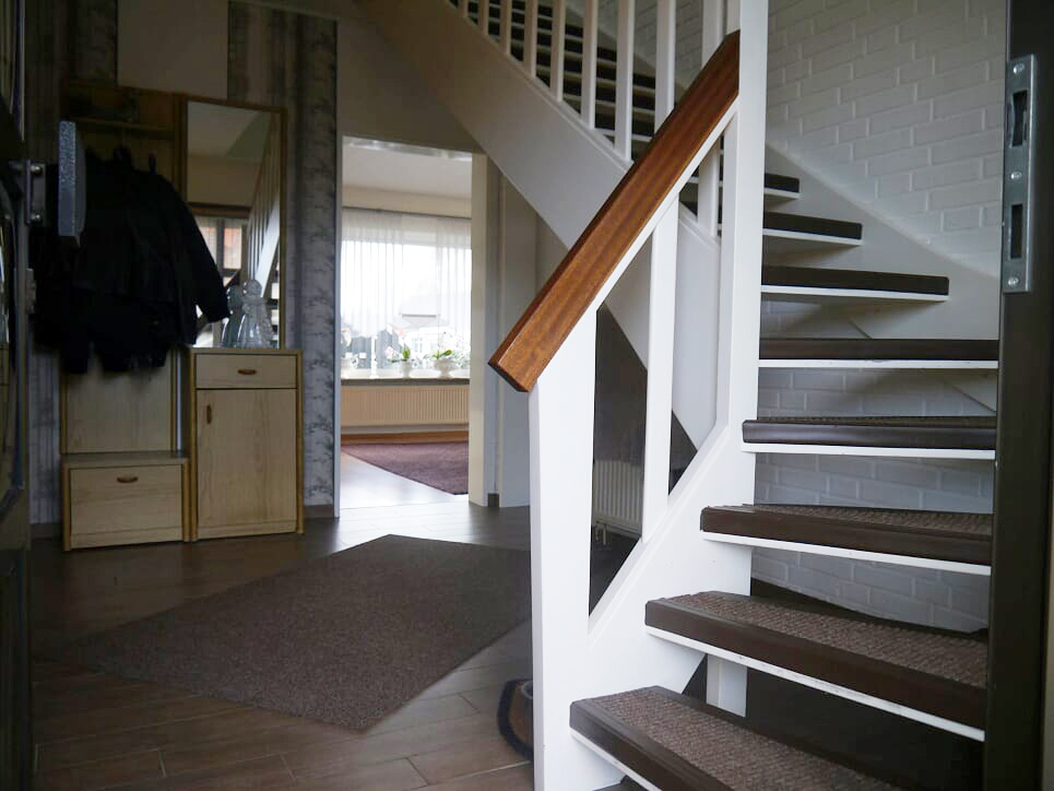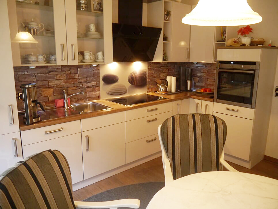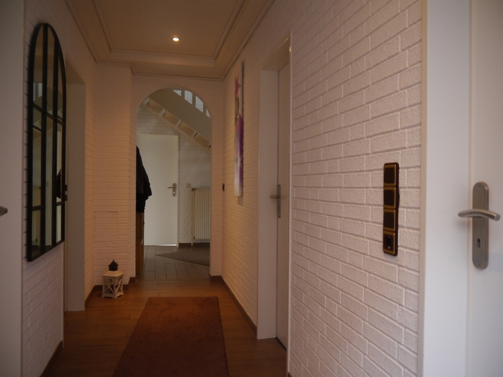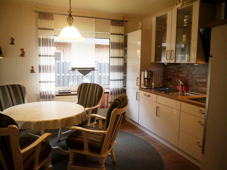Alle eingebauten Fenster und Aussentüren verfügen über eine zweifache Isolierverglasung und zweifarbige Folierung (aussen braun, innen weiß). Nahezu das gesamte Haus wurde von innen erst 2015 grundlegend modernisiert. Es wurden die Böden und Decken in der Diele, in der Küche, im Flur und im Wohnzimmer erneuert. Auch die hochwertige und maßgefertigte Einbauküche (nobilia) stammt aus dem Jahr 2015 und befindet sich im Neuzustand. Sie ist mit Einbaugeräten der Firma Neff und Bosch bestückt worden.