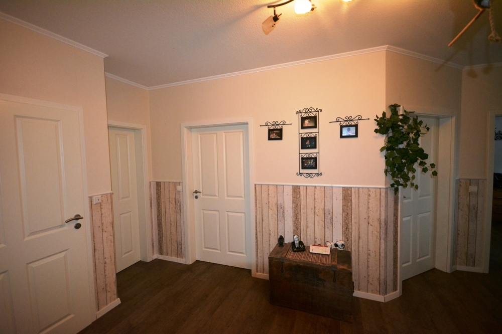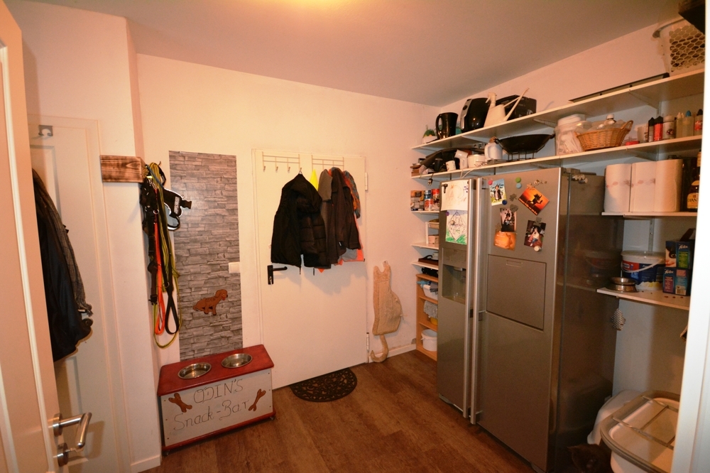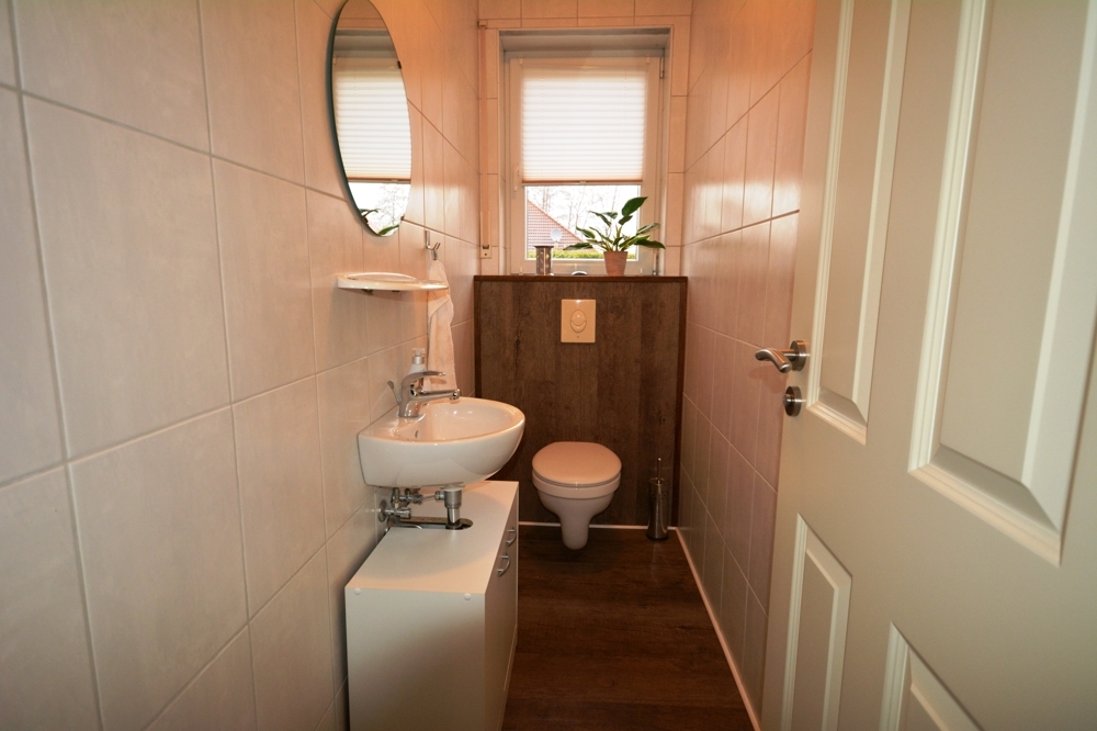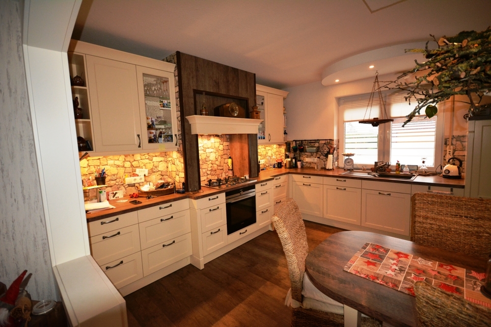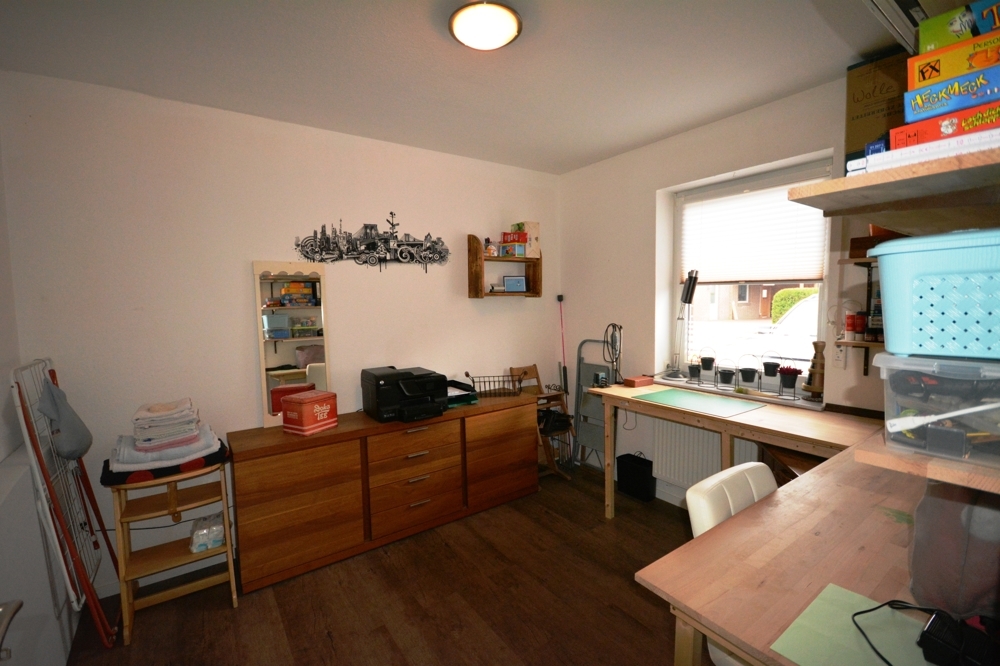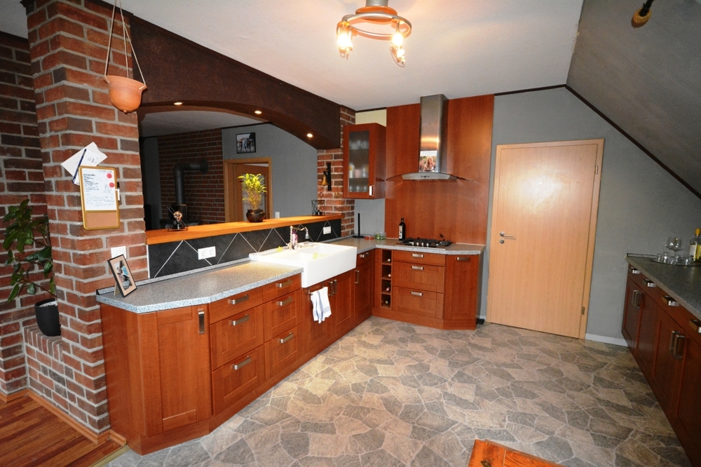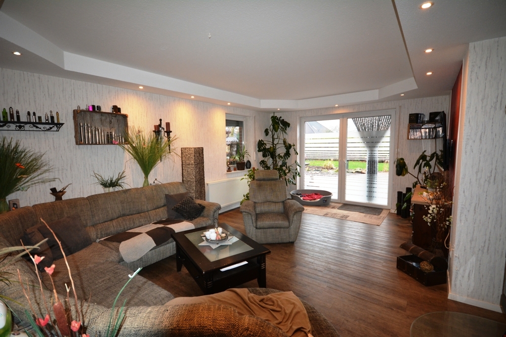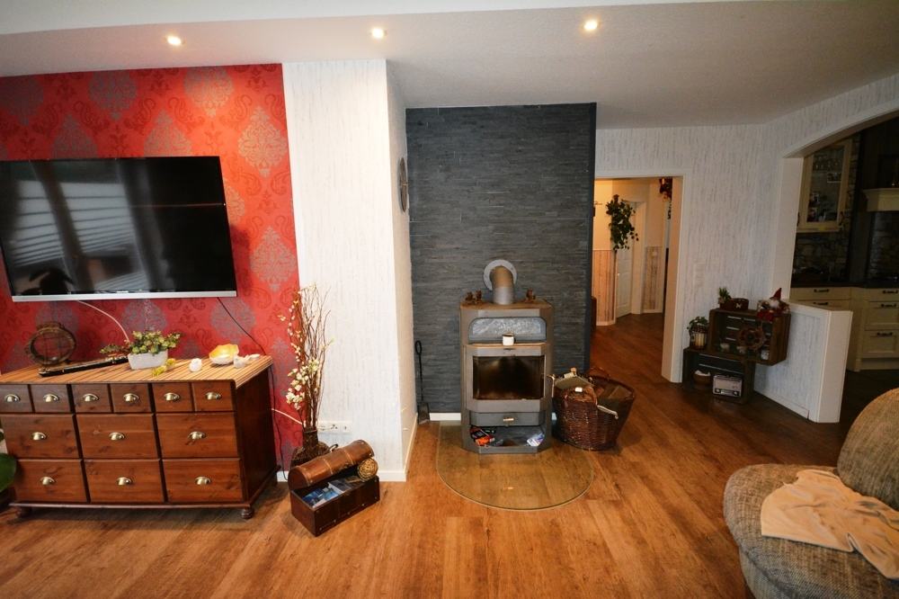 Wohnzimmer mit Kaminofen, Küche, Hauswirtschaftsraum, Flur, Bad mit Dusche und Wanne, Gäste WC, Schafzimmer, Abstellraum, Ankleide, Gästezimmer, Diele, Garage, Werkstatt.