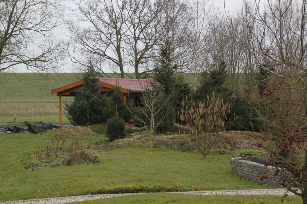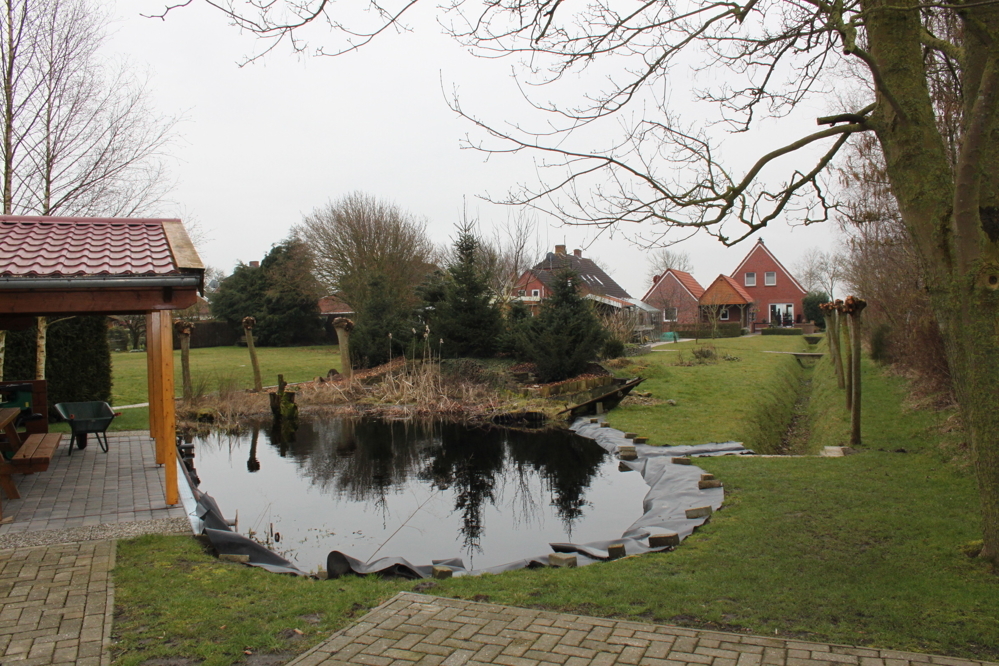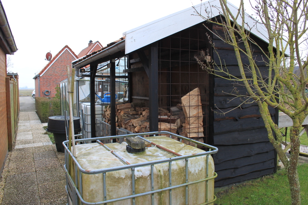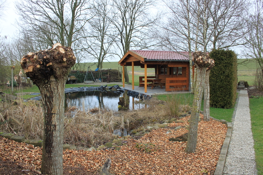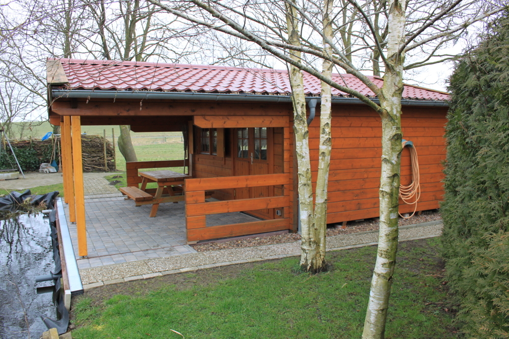 Der hintere Garten ist mit einer Hecke eingefasst und weitgehend vor fremden Blicken geschützt. Schöne, gemütliche Stunden kann man an der Holzhütte mit dem angrenzendem Gartenteich erleben. Auch der Kleingärtner unter Ihnen kann sich im Gewächshaus seine Blütenpracht selbst heranziehen.
