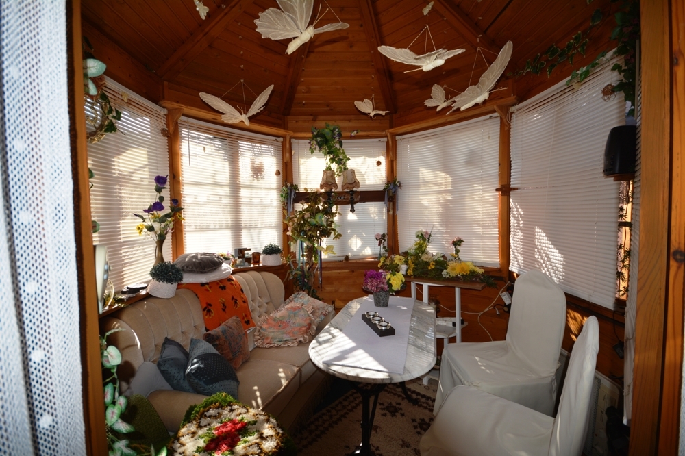 Der eingezäunte Garten mit einem Pavillion und Grillunterstand.