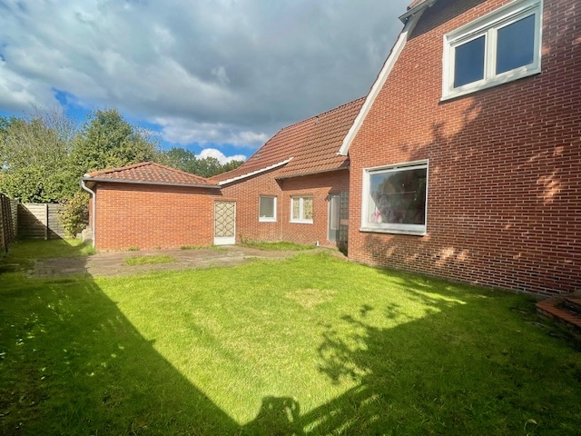 Zur Strasse hin befindet sich ein schnuckliger Rasen-Gartenanteil, der durch einen Metallzaun eingefriedet ist und sich ganz nach Ihren Vorstellungen gestalten und nutzen lässt. Eine gepflasterte Auffahrt, die durch einen Holzzaun zum Nachbargrundstück abgegrenzt ist, führt geradewegs in die geräumige Garage, die nicht nur Platz für Ihren Pkw bietet. Zum Tüfteln und Basteln ist hier ebenso genügend Platz und Ablagefläche vorhanden. Zwischen Garage und Holzzaun ist ein praktischer Durchgang zum nordwestlich gerichteten Gartenanteil, der zum einen von der hinteren Wohneinheit über die Küche begehbar ist, und zum anderen über den Geräteraum Zugang findet. Dieser praktische und geräumige Geräteraum hat zudem Anbindung zur vorderen Wohneinheit gehörigen Südwestterrasse. Diese wunderbare Südwestterrasse mit zusätzlicher Rasenfläche ist durch einen stabilen Sichtschutz-Zaun bestens eingefriedet und leistet eine tolle Privatsphäre. Die Südwestterrasse ist vom Wohnraum der vorderen Wohneinheit jeweils über die Stube und die Waschküche begehbar.