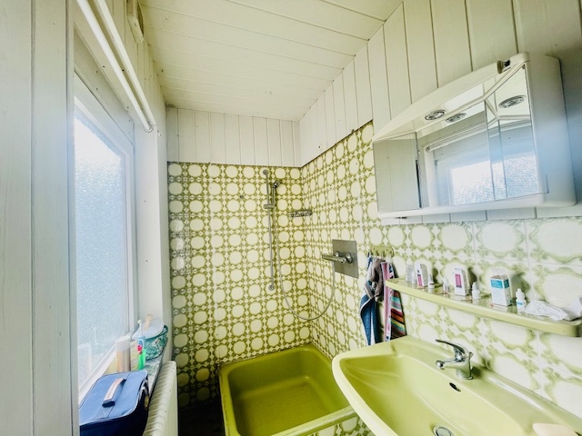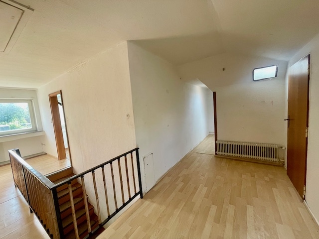 Wohnzimmer mit seinen fast bodentiefen Fenstern führt und von dem man die Südwestterrasse erreicht. Zudem sind über die Diele Küche, WC und die Waschküche erreichbar. Über eine Treppe nach oben bieten sich im Dachgeschoss neben einem schicken Tageslichtbad mit ebenerdiger Eckdusche vier weitere Zimmer an, die ganz nach eigener Vorstellung bewohnt und gestaltet werden möchten. Vom Flur des Dachgeschosses gelangt man
