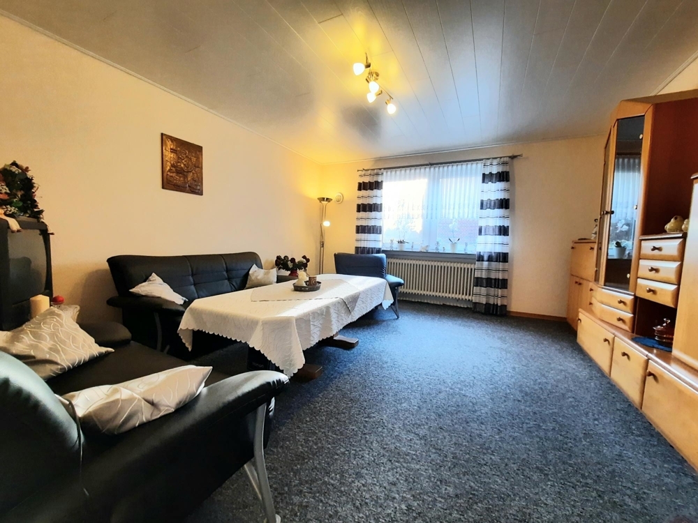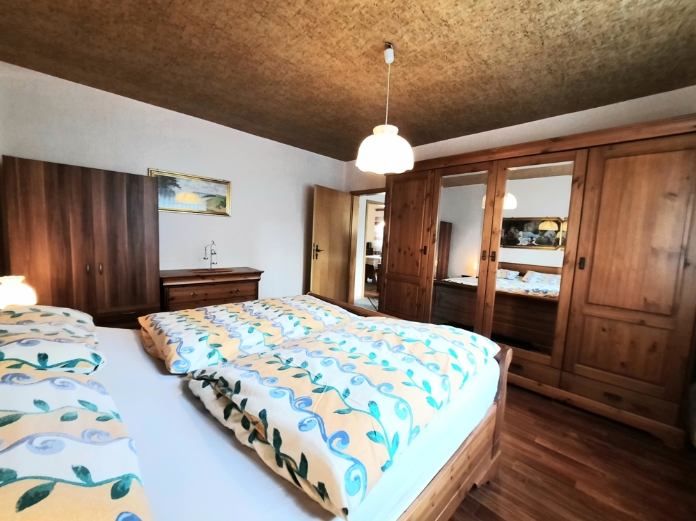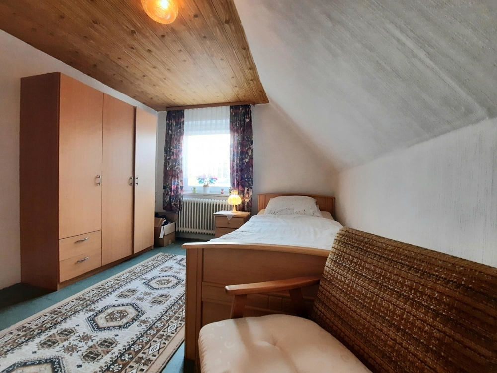Das Wohnhaus beherbergt im Erdgeschoss einen großzügigen Haupteingangsbereich, abgehend davon einen Flur, von dem aus man in das 2010 sanierte und modernisierte, barrierefreie Vollbad mit ebenerdiger Dusche gelangt. Ebenfalls abgehend vom Eingangsbereich geht man nach links in den Wohnbereich, wo sich eine sehr geräumige Küche, ein großes Wohnzimmer, das Elternschlafzimmer und ein weiteres, kleineres Wohn- u. Fernsehzimmer befindet. Vom Wohn- u. Fernsehzimmer kommt man in den rd. 30qm großen Sommergarten (im Holzanbau) und von dort aus wiederum in den etwa 750qm großen, komplett eingefriedeten und uneinsehbaren Gartenbereich. Geht man im Haupteingangsbereich nach rechts, gelangt man in den Mitte der 70er Jahre erstellten Anbau, der zahlreiche, große Nutzflächen, Wirtschaftsräume, Lagerräume sowie den Heizungs- u. Technikraum beinhaltet. Umgestaltungen / Nutzungsänderungen zur Wohnfläche oder sogar der Einbau einer separaten Einliegerwohnung wären möglich. Das Dachgeschoss, das über die Holztreppe im Eingangsbereich erreicht wird, beherbergt momentan ein geräumiges Schlafzimmer und ein großzügig geschnittenes Gästezimmer. Darüber hinaus viele, ausbaufähige und noch frei zu gestaltende Nutzflächen bzw. begehbare Dachbereiche. Hier könnte natürlich auch weiterer Wohnraum entstehen. Auch der später erstellte Anbau könnte auf zwei Ebenen zu einer Einlieger- oder Ferienwohnung ausgebaut werden, wenn die Baubehörden dem zustimmen. Der Anbau verfügt über eine Betonzwischendecke, das Haupthaus über eine Holzzwischendecke. Auf dem Areal befindet sich zudem eine etwa 25qm große PKW-Garage mit Tor und Seitentür, die weder in die Flächenberechnung, noch in die Bewertung einfloss.
