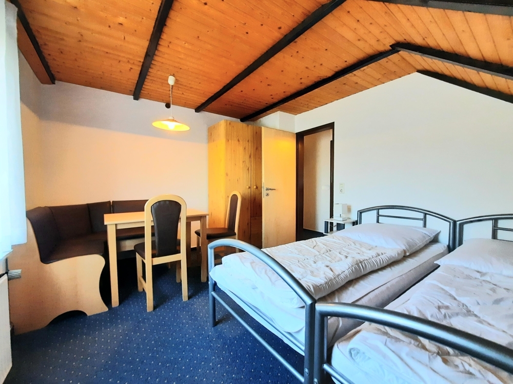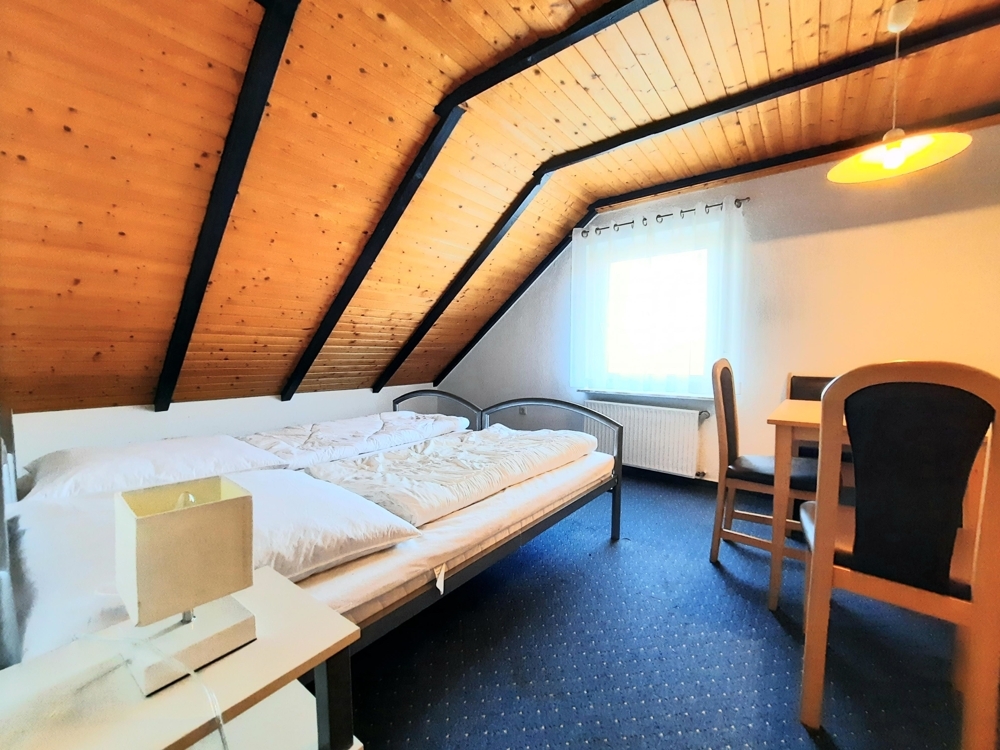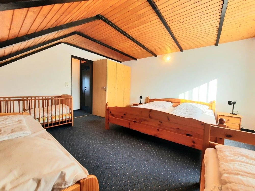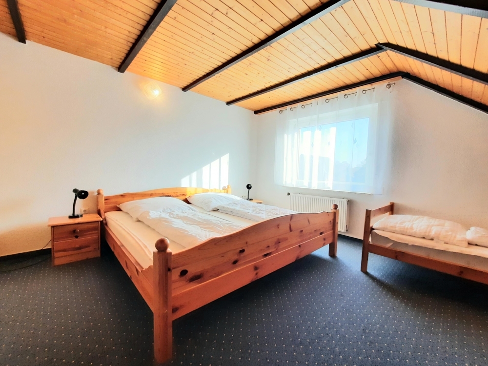 Dieses Wohnhaus mit Anbau wurde im Jahre 1987 mit entsprechend hochwertigen Materialien erbaut und bezogen. Das Hauptgebäude beherbergt zwei Ferienwohnungen zu ebener Erde, ergo parterre. Im ehem. Garagengebäude (Anbau) ist eine weitere ca. 40qm große Ferienwohnung zu ebener Erde. Einer der drei vermietbaren Ferienwohnungen befindet sich auf zwei Ebenen. Hier befinden sich zwei großzügige Schlafräume und ein Flur mit Garderobe. Die Eigentümer- bzw. Betreiberwohnung, befindet sich im Anbau über den ehem. Garagen und verfügt über eine vollüberdachte Loggia, die nach Norden ausgerichtet ist und über einen eigenen Eingangsbereich verfügt, in dem sich auch die neue Heizungsanlage befindet.