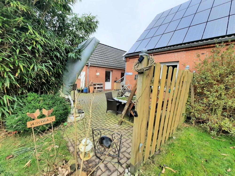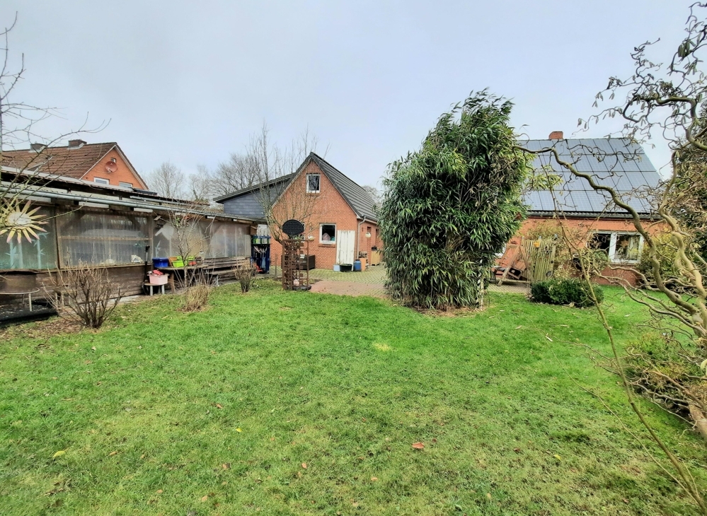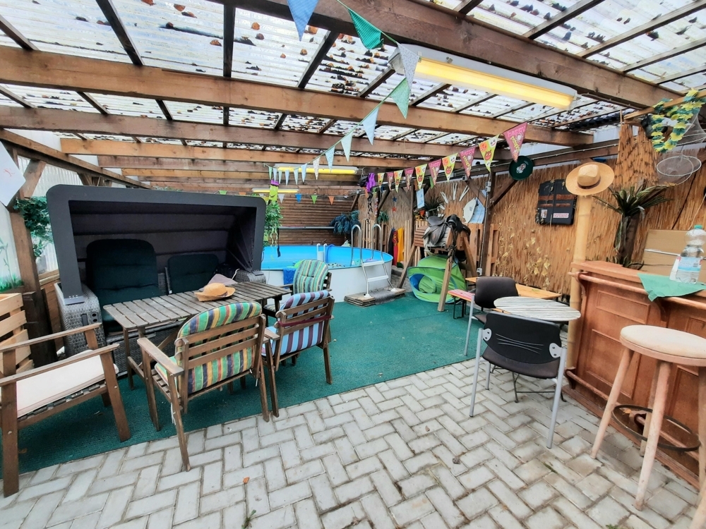 Der Gartenbereich ist pflegeleicht angelegt, der Vorgarten mit diversen Blumenbeeten, Hecken, Büschen und anderen Ziergewächsen. Vor und neben dem Haus sowie den Nebengebäuden befinden sich ausgepflasterte Wege. Auch die Carportanlage ist vollständig ausgepflastert und hat eine Durchfahrtshöhe von mehr als 3,40m. Somit ist sie für Wohnmobile, Anhänger oder Spezialfahrzeuge aller Art geeignet. Der hintere Gartenbereich ist ebenfalls mit diversen Beeten, Büschen, Sträuchern und Bäumen bepflanzt und eingefriedet. Zwischen dem Wohnhaus und dem Nebengebäude befindet sich ein großzügiger Innenhof. Am Ende der gepflasterten Hoffläche im rückwärtigen Bereich, befindet sich eine überdachte und sichtgeschützte, beheizte Pool-Anlage sowie genügend Platz für Sitzgelegenheiten (Strandkörbe) oder auch eine Tiki-Bar – ganz nach Gusto der zukünftigen Eigentümer.